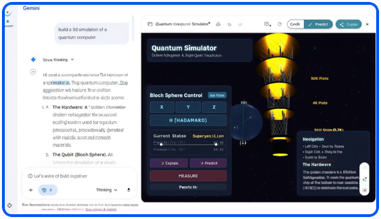 In this tutorial, you'll learn how to use Gemini 3 to create interactive simulations, educational visualizations, and fully functional tools in a single workflow—leveraging its benchmark-shattering capabilities for visual learning and rapid prototyping. Step-by-step: 1. Go to the Gemini homepage and select "Gemini 3 Pro" for reasoning, or "DeepThink" for advanced performance (confirm availability in your region). 2. Enter your prompt in the chat box - for example: "Build a 3D simulation of a quantum computer". 3. Review the immersive simulation output and click "Explain" to activate the AI tutor for summarized learning. You can then view or share the code. 4. Experiment with different projects such as games, content schedulers, or data dashboards. If the simulation is not functional or visually appealing, refine your prompt and try again. 💡 Pro Tip: When aiming for high-quality simulations, start with Gemini 3 Pro for clearer visual logic, then iterate prompts by adding constraints (e.g., interactivity, real-time data, UI controls). This layered prompting approach significantly improves both functionality and visual depth. | | 📸 AI Generator Images: Games