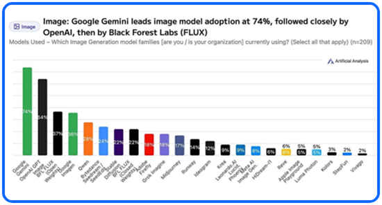 Brief Buzz: AI is officially reshaping creative workflows — fast. A new State of Generative Media 2025 report from Artificial Analysis surveyed 300 developers and creators, revealing how deeply generative tools have embedded into daily work and where Google is stealing the spotlight. - Google dominates: Gemini leads with 74% of AI image use, while Veo claims 69% of AI video creators, outpacing OpenAI and Midjourney.