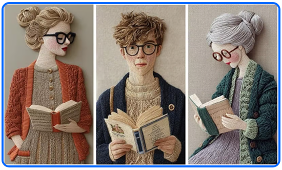 ChatGPT Prompt: A highly detailed textile art illustration of a [subject/character description], crafted entirely from yarn and embroidery thread. They have [hair color and style made of yarn], [facial features / accessories like glasses, rosy cheeks, wrinkles, lips, etc.], and wear a [primary clothing item with fabric texture] paired with a [outer garment with distinct texture, color, and details like buttons or sleeves]. One hand [action with a book — e.g., holding an open book with a beige cover and colored border], while the other [casual gesture — in pocket, on lap, resting at side, etc.]. The entire artwork is made from meticulously arranged yarn, thread, and fabric textures on a neutral canvas background, showing extreme attention to detail in the [woven hair strands, knitted clothing patterns, embroidery stitching, etc.] | |